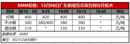 12月6日广东铜现货市场各时段升贴水(第三时段10:15)【SMM价格】