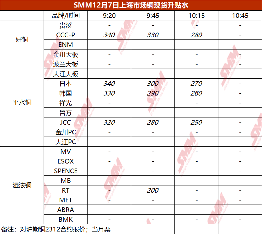 12月7日上海市场铜现货升贴水(第三时段)【SMM价格】