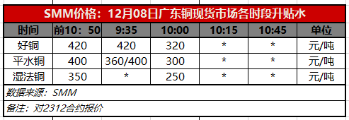 12月8日广东铜现货市场各时段升贴水(第二时段10:00)【SMM价格】