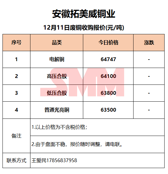 12月11日安徽拓美威 废铜收购报价