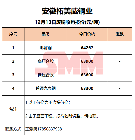 12月13日安徽拓美威 废铜收购报价