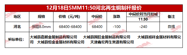 12月18日SMM河北地区再生铜制杆报价
