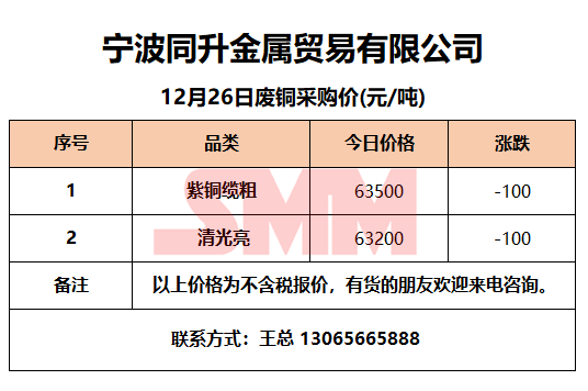 12月26日同升金属 废铜采购报价