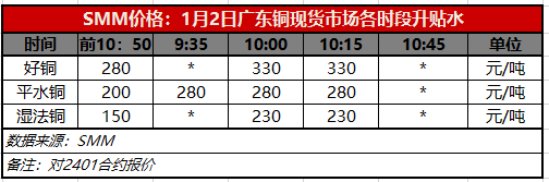 1月2日广东铜现货市场各时段升贴水(第三时段10:15)【SMM价格】