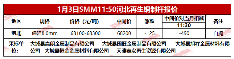 1月3日SMM河北地区再生铜制杆报价