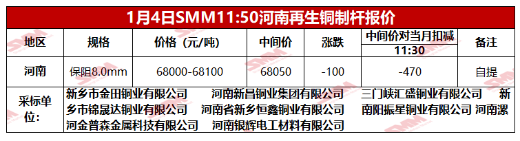 1月4日SMM河南地区再生铜制杆报价