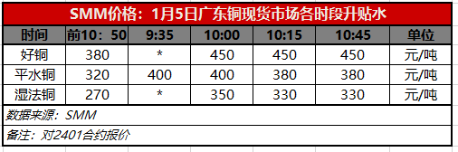 1月5日广东铜现货市场各时段升贴水(第四时段10:45)【SMM价格】