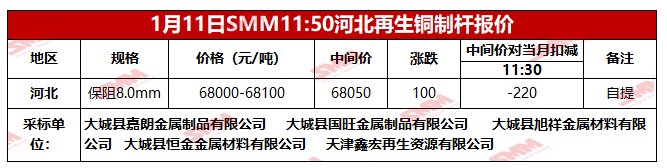 1月11日SMM河北地区再生铜制杆报价