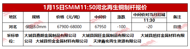 1月15日SMM河北地区再生铜制杆报价