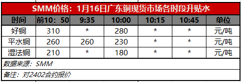 1月16日广东铜现货市场各时段升贴水(第二时段10:00)【SMM价格】