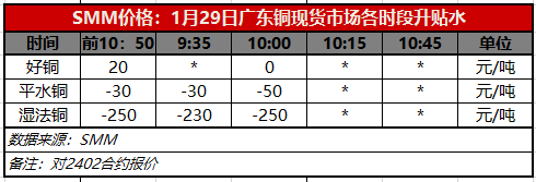 1月29日广东铜现货市场各时段升贴水(第二时段10:00)【SMM价格】