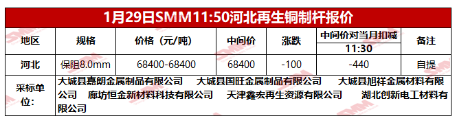 1月29日SMM河北地区再生铜制杆报价