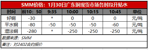 1月30日广东铜现货市场各时段升贴水(第四时段10:45)【SMM价格】