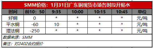 1月31日广东铜现货市场各时段升贴水(第一时段9:30)【SMM价格】