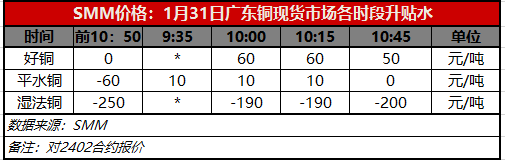 1月31日广东铜现货市场各时段升贴水(第四时段10:45)【SMM价格】