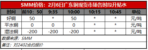 2月6日广东铜现货市场各时段升贴水(第二时段10:00)【SMM价格】