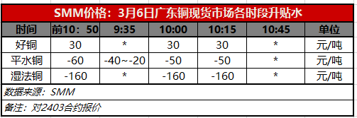 3月6日广东铜现货市场各时段升贴水(第三时段10:15)【SMM价格】