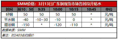3月13日广东铜现货市场各时段升贴水(第三时段10:15)【SMM价格】
