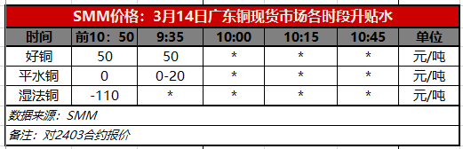 3月14日广东铜现货市场各时段升贴水(第一时段9:30)【SMM价格】