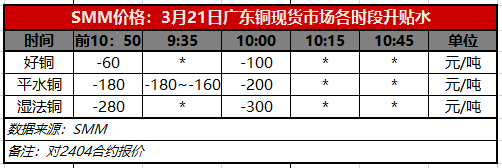3月21日广东铜现货市场各时段升贴水(第二时段10:00)【SMM价格】