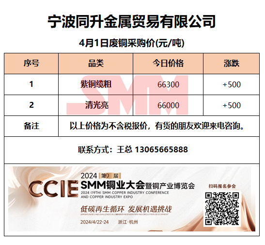 4月1日同升金属 废铜采购报价