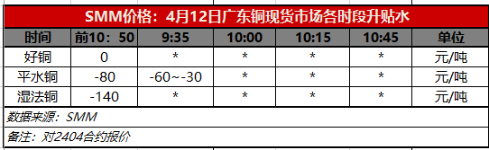 4月12日广东铜现货市场各时段升贴水(第一时段9:30)【SMM价格】
