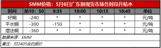 5月6日广东铜现货市场各时段升贴水(第一时段9:30)【SMM价格】