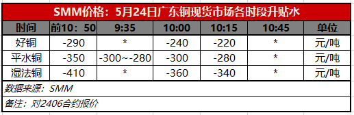 5月24日广东铜现货市场各时段升贴水(第三时段10:15)【SMM价格】