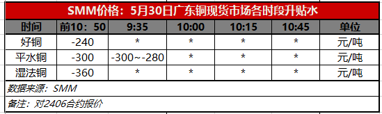 5月30日广东铜现货市场各时段升贴水(第一时段9:30)【SMM价格】
