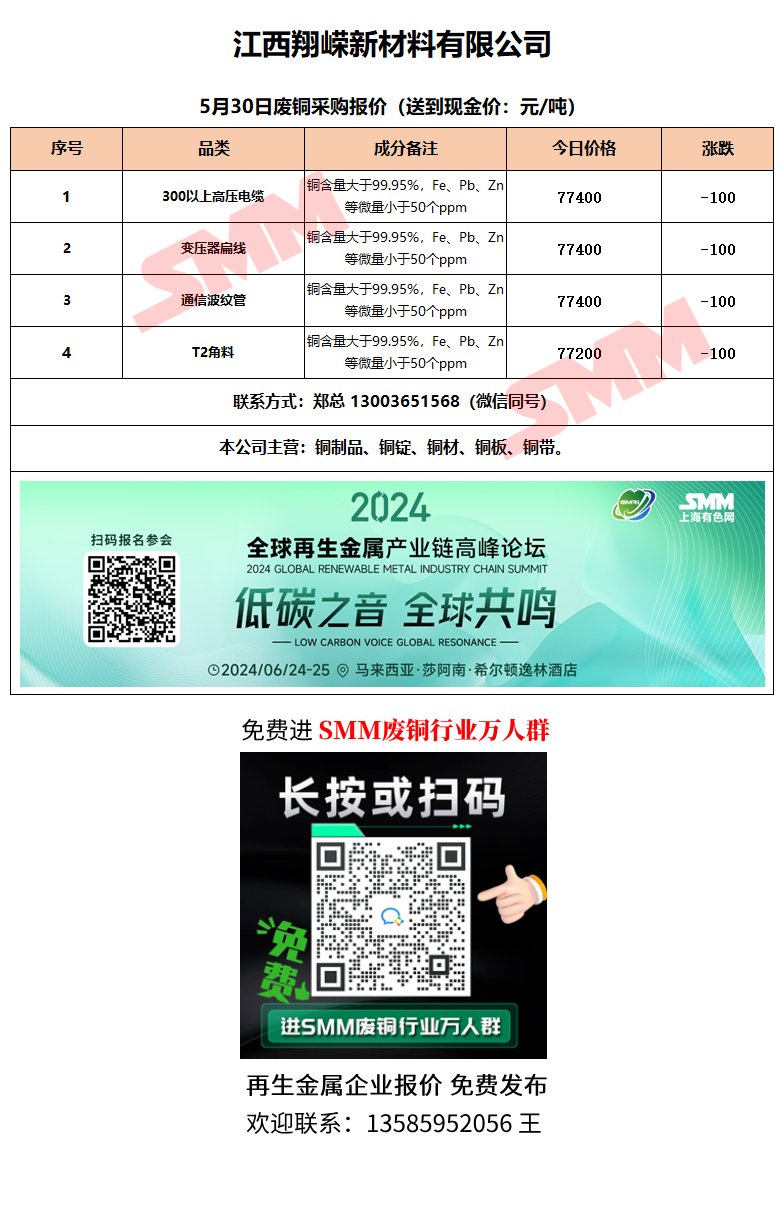 5月30日江西翔嵘新材料 废铜采购报价