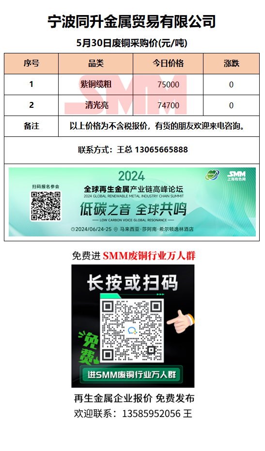 5月30日同升金属 废铜采购报价