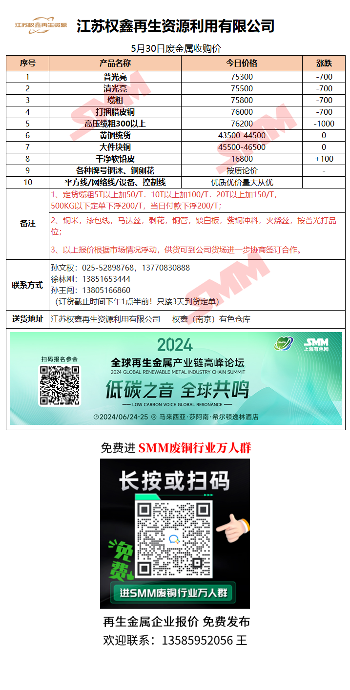 今日江苏权鑫 废铜采购报价已更新,有货的朋友欢迎联系我们!