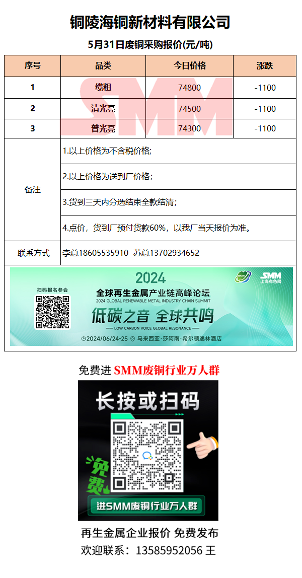 5月31日铜陵海铜 废铜采购报价
