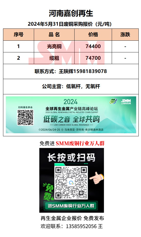 今日河南嘉创 废铜采购报价已更新,有货的朋友欢迎联系我们!