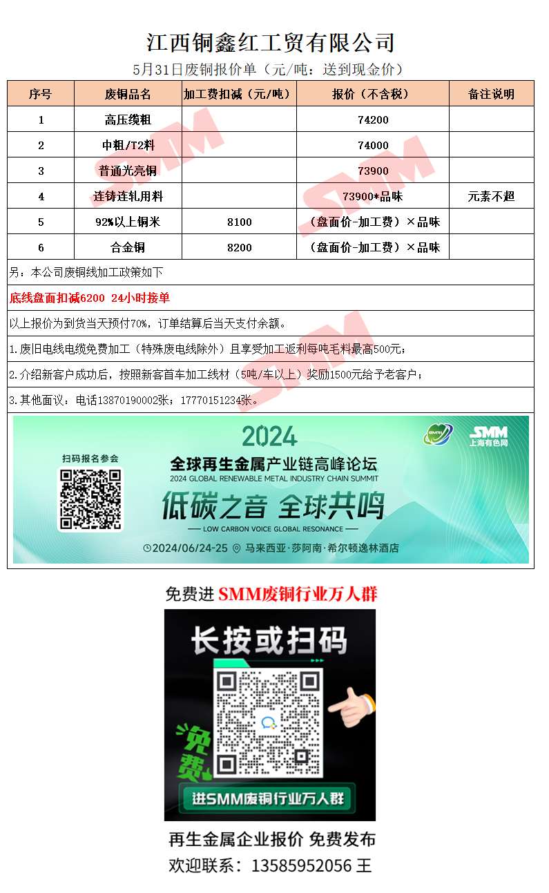 5月31日江西铜鑫红 废铜采购报价