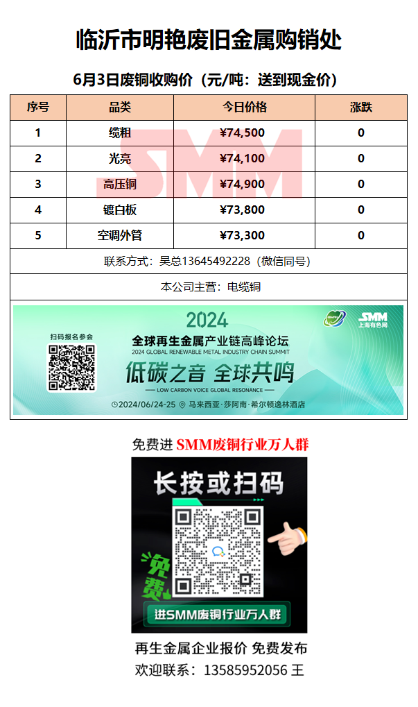 6月3日临沂明艳废旧金属 废铜采购报价