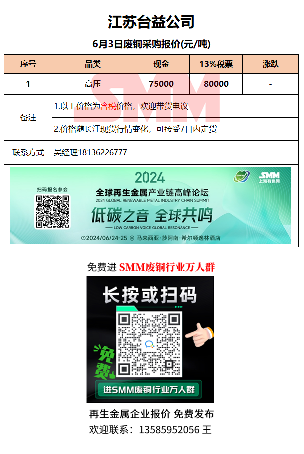 6月3日江苏台益 废铜采购报价