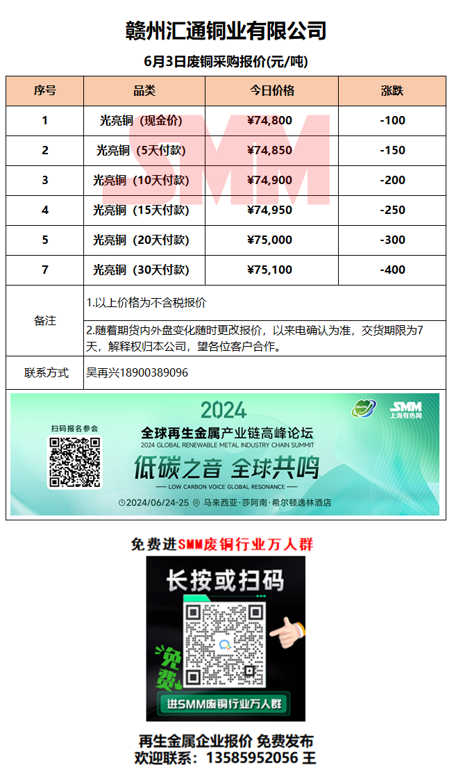 6月3日赣州汇通 废铜采购报价