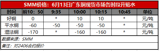 6月13日广东铜现货市场各时段升贴水(第三时段10:15)【SMM价格】