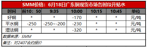 6月18日广东铜现货市场各时段升贴水(第二时段10:00)【SMM价格】