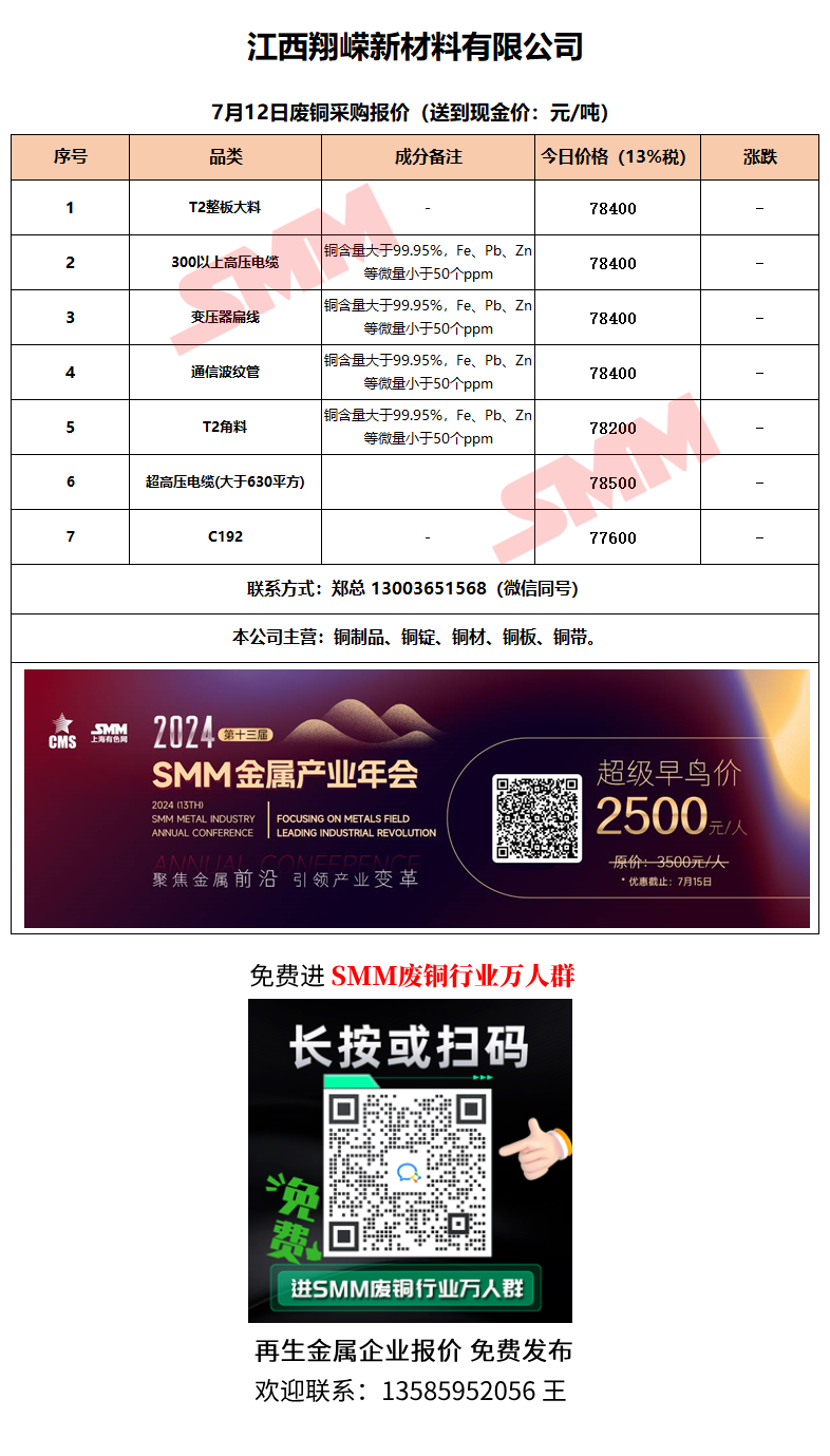 今日江西翔嵘新材料 废铜采购报价已更新,有货的朋友欢迎联系我们!