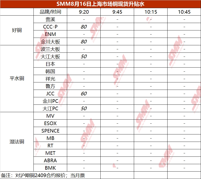 8月16日上海市场铜现货升贴水(第一时段)【SMM价格】