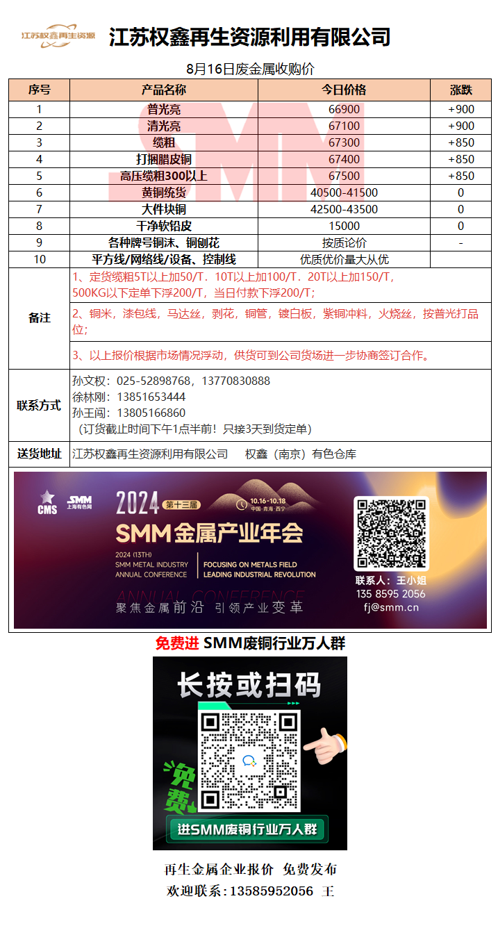 8月16日江苏权鑫 废铜采购报价
