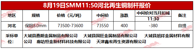 8月19日SMM河北地区再生铜制杆报价