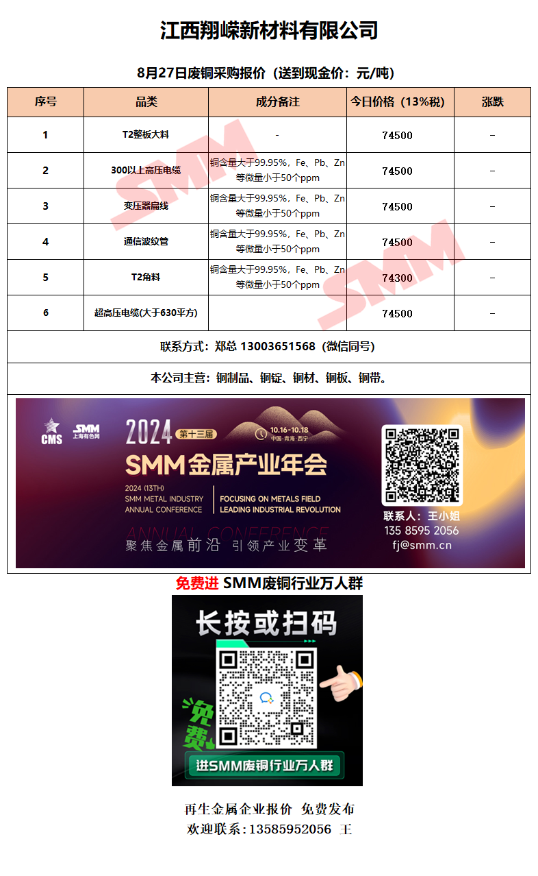 8月27日江西翔嵘新材料 废铜采购报价