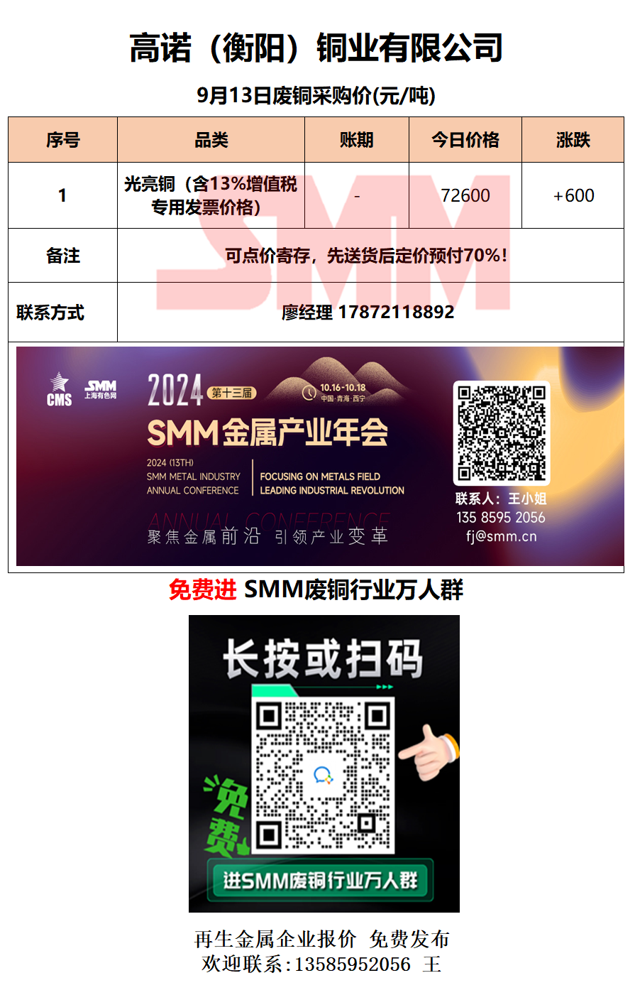 9月13日高诺(衡阳)铜业 废铜采购报价