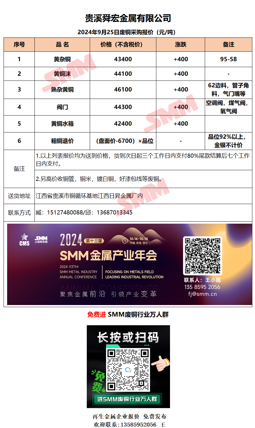 9月25日贵溪舜宏 废铜采购报价
