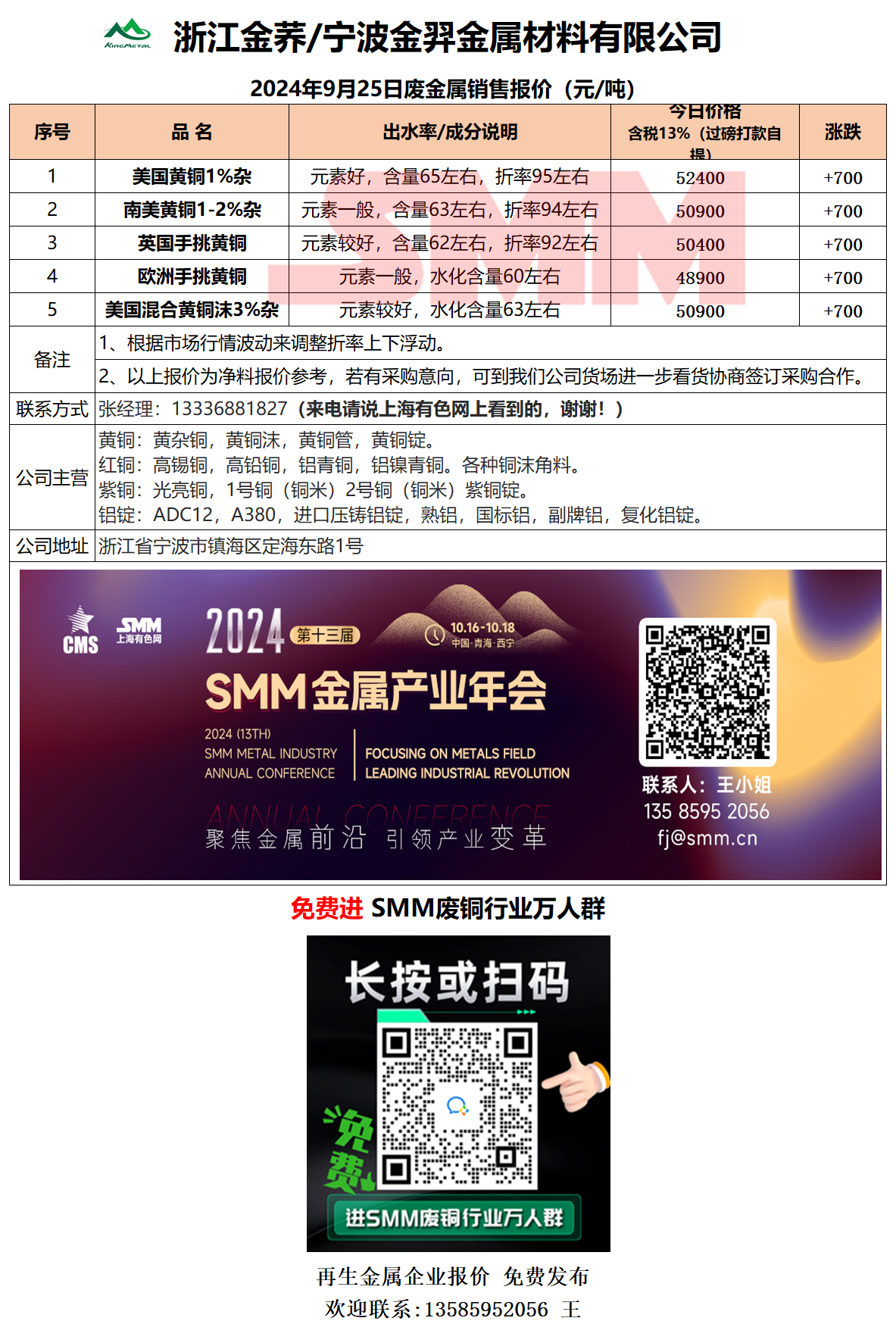 9月25日浙江金荞 宁波金羿 废铜采购报价