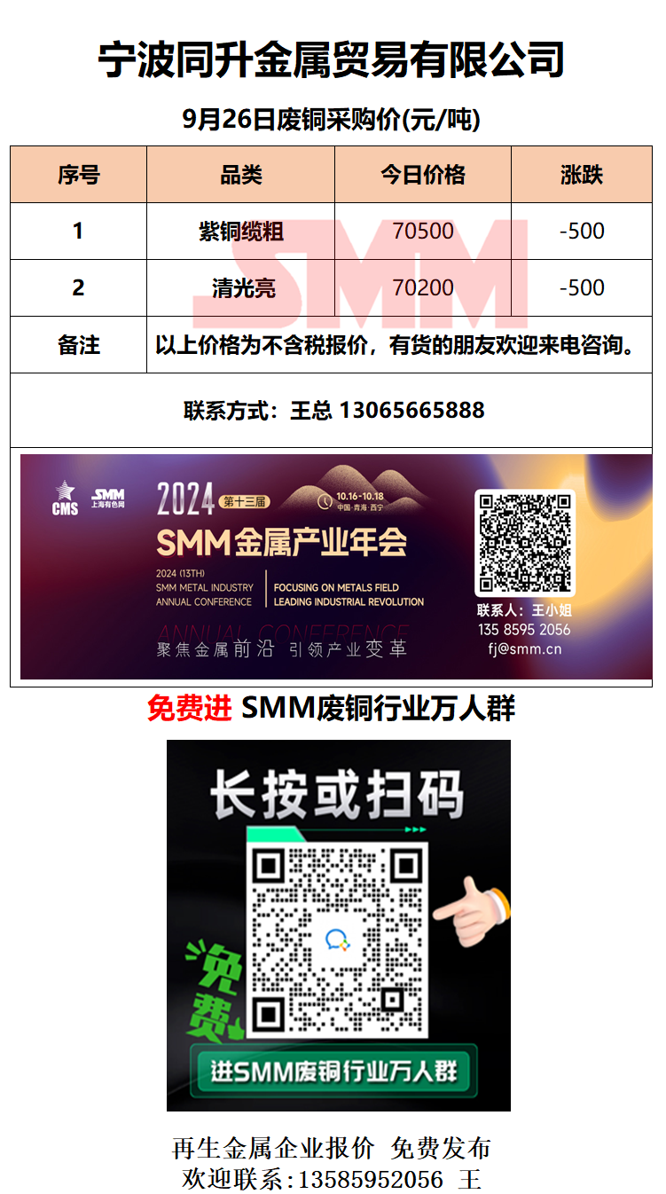 今日同升金属 废铜采购报价已更新,有货的朋友欢迎联系我们!
