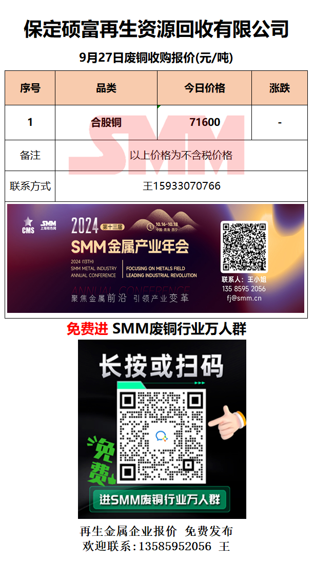9月27日保定硕富 废铜采购报价
